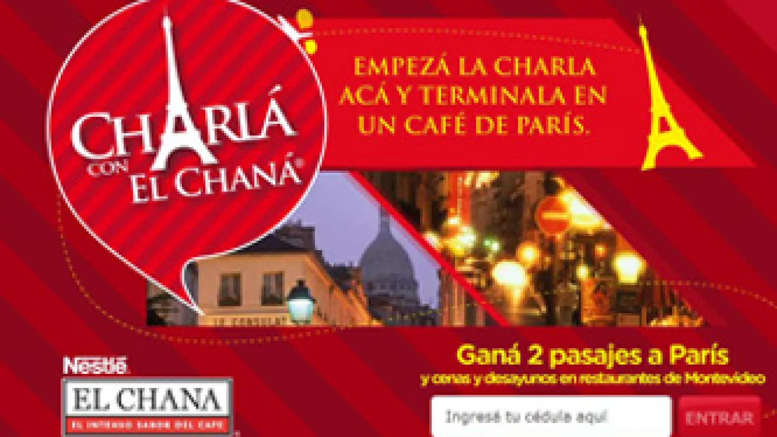 La marca de café El Chaná implementó una promo muy seductora. Te propone empezar una charla acá y terminarla tomando un café en París (regala dos pasajes). Sólo hay que entrar en el microsite y subir tus datos, además de los códigos del pack. Además hay cenas y desayunos en restaurantes de Montevideo.
