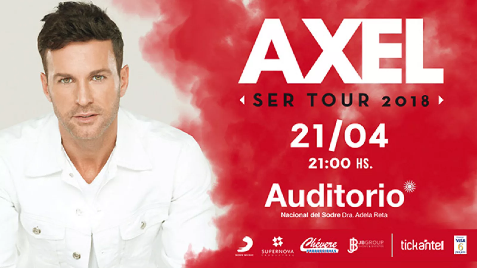 El próximo 21 de abril, a las 21 horas, el artista argentino Axel se presentará en el Auditorio Nacional del Sodre, Adela Reta. Las entradas se venden por Tickantel a partir de $1.080 y además se pueden comprar en Abitab, Red Pagos, Tienda Inglesa, Tiendas Antel y en Boleterías del Auditorio.