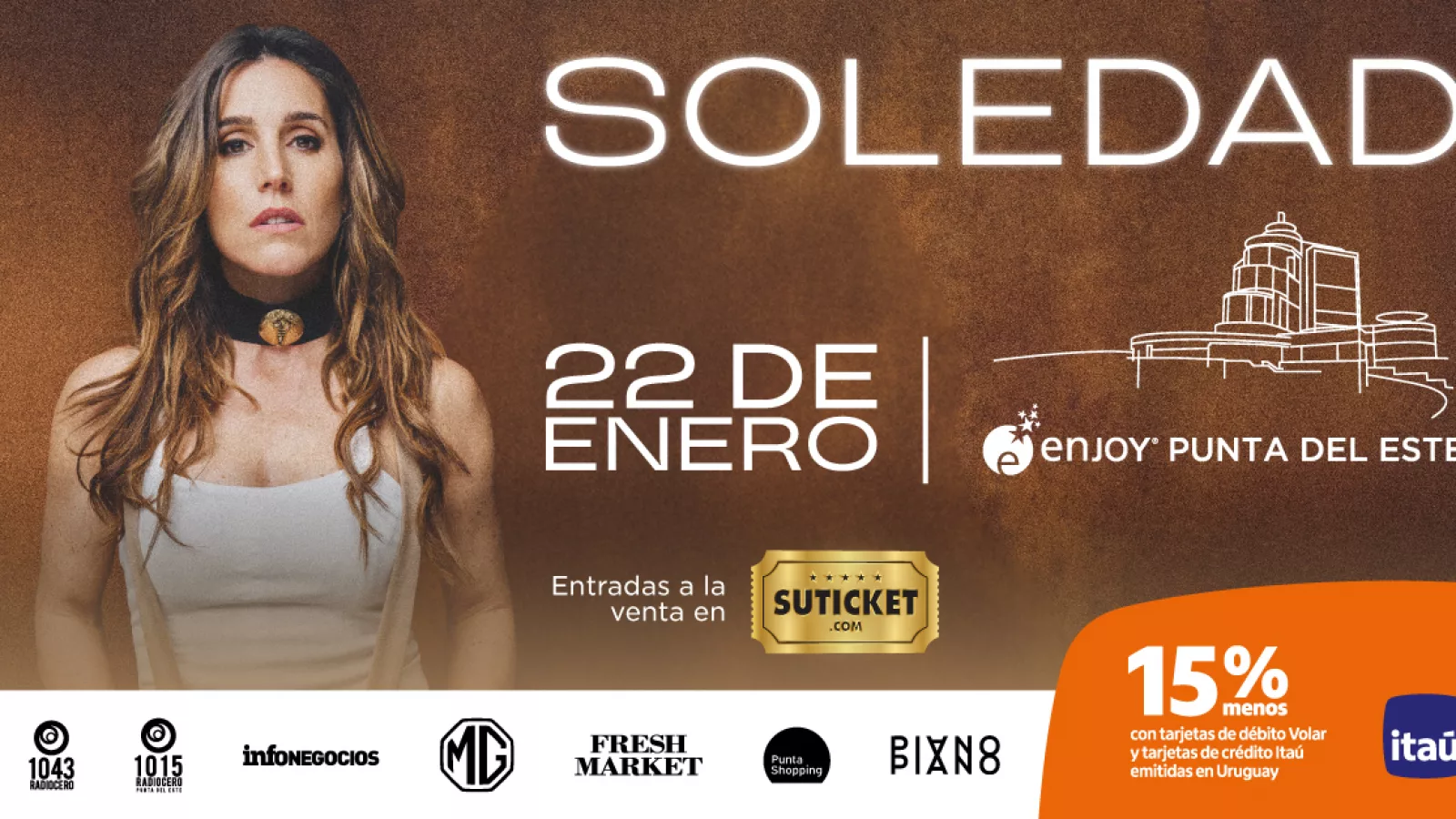 El 22 de enero, Soledad Pastorutti se presentará en Enjoy Punta del Este con un show que recorre 29 años de trayectoria. Reconocida con múltiples Latin GRAMMY®, dos Premios Diamante y más de un centenar de discos de Oro y Platino, “La Sole” volverá a interpretar las canciones que marcaron generaciones, entre ellas Brindis, en una de las últimas grandes citas musicales de enero.