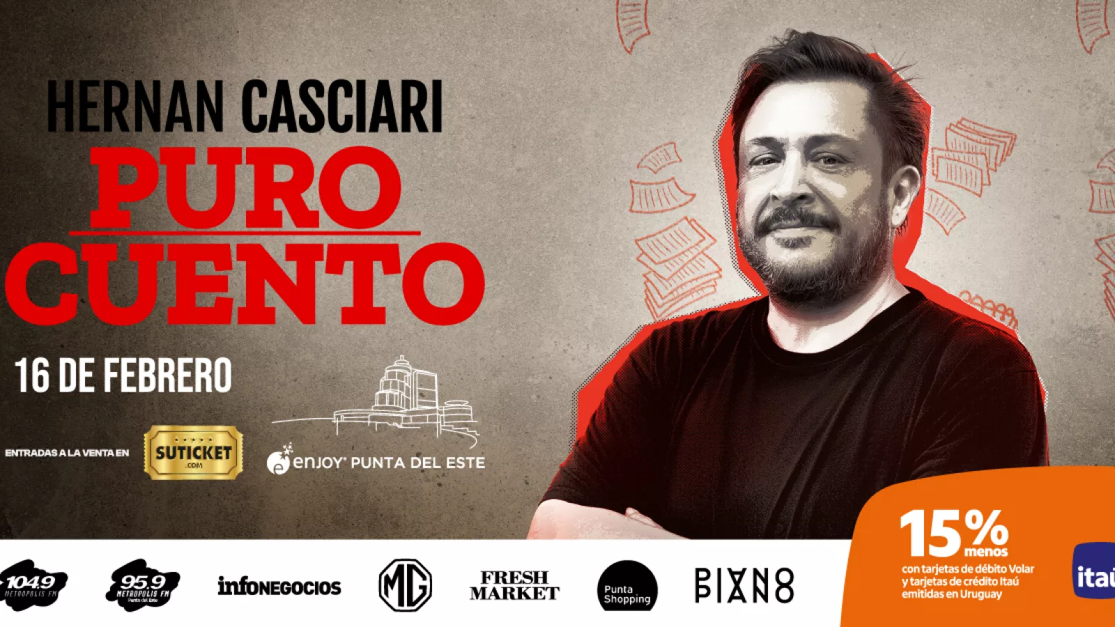 Finalmente, el 16 de febrero, Hernán Casciari se presentará con Puro Cuento, un recital literario en el que cada función es distinta. En un formato cercano, el autor comparte relatos que cruzan humor, emoción y reflexión, y que proponen una experiencia diferente dentro de la agenda de espectáculos del verano.