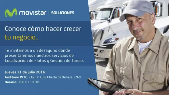 Este jueves 21 de julio de 9 a 11 horas, en el Auditorio del World Trade Center, Movistar ofrecerá un desayuno para presentar sus servicios de Localización de Flotas y Gestión de Tareas, los cuales apunta a hacer llegar a las empresas.