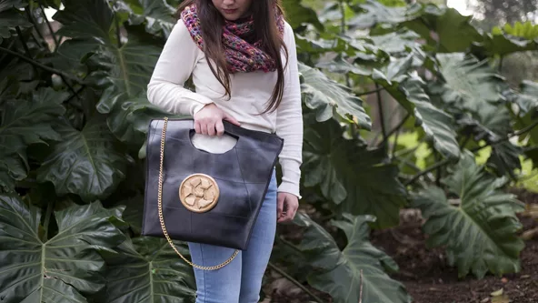 Esta última es el emprendimiento sostenible de Karina Casalás. La diseñadora arma toda su colección basándose principalmente en el reciclaje de neumáticos usados. Así, crea desde accesorios como carteras y mochilas, hasta prendas como camperas y pantalones.