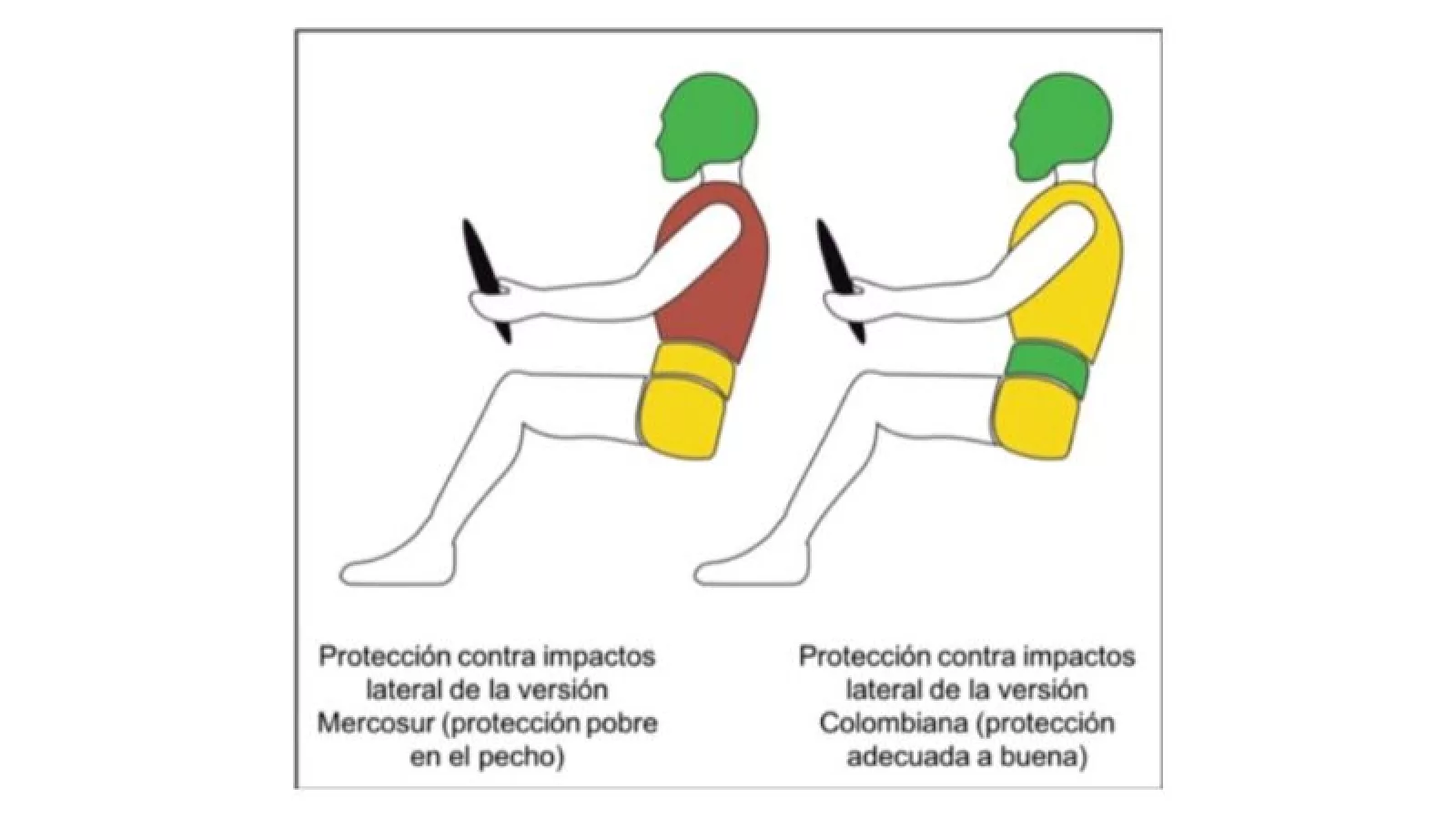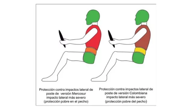 Estas tres diferencias se traducen en una mejor protección contra impactos laterales e impactos laterales de poste de la versión colombiana sobre la versión Mercosur.