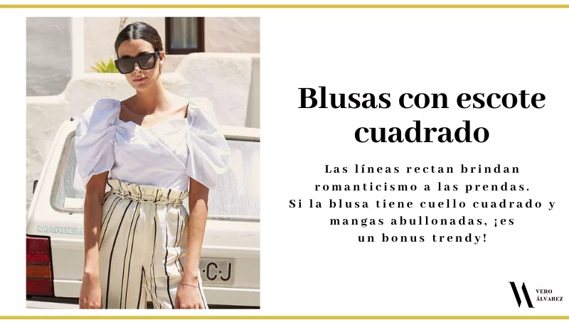 - Blusas con escotes cuadrados: el escote cuadrado es nuevamente una de las grandes apuestas de la temporada de calor, donde las líneas rectas brindan romanticismo a las prendas. Es importante que sepan que es un escote que le queda bien a cualquier tipo de cuerpo, no importa el tipo de cuello que tengan o la distancia entre los hombros ya que es un corte que ensancha el escote generando un foco visual. Si la prenda tiene cuello cuadrado y mangas abullonadas, ¡es un bonus trendy!
