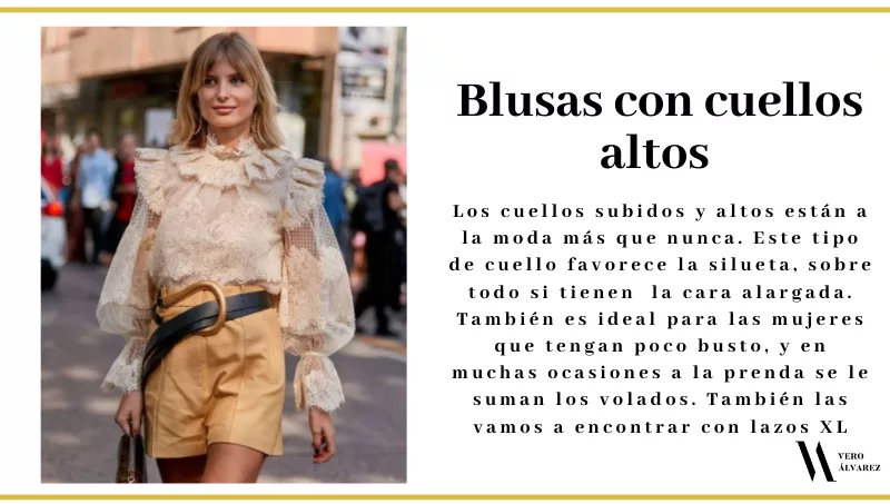 -Blusas con cuellos altos cerrados: los cuellos subidos y altos están a la moda más que nunca. Este tipo de cuello en verano, no es una locura, al contrario, es muy favorecedor ya que estiliza mucho y favorece la silueta, sobre todo si tienen la cara alargada (porque achata los rasgos), o el cuello fino (porque lo disimula). También es ideal para las mujeres que tengan poco busto, y en muchas ocasiones a la prenda se le suman los volados. También las vamos a encontrar con lazos XL.