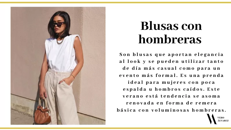 -Blusas con hombreras: las clásicas hombreras que amaban nuestras madres ya las podemos volver a usar. Son blusas que aportan elegancia al look y se pueden utilizar tanto de día más casual como para un evento más formal. Es una prenda ideal para mujeres con poca espalda u hombros caídos. Este verano esta tendencia se asoma renovada en forma de remera básica con voluminosas hombreras.