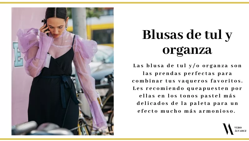 -Blusas de tul y organza: estos tejidos vienen conquistando las grandes pasarelas internacionales, tanto en las prendas confeccionadas en su totalidad por estas telas o en apliques. Las blusa de tul y/o organza son las prendas perfectas para combinar tus vaqueros favoritos. Les recomiendo que apuesten por ellas en los tonos pastel más delicados de la paleta para un efecto mucho más armonioso.