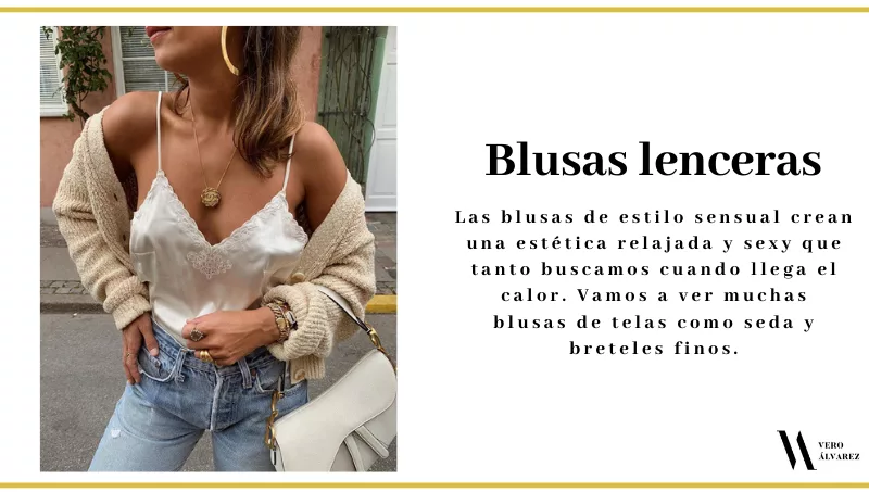 -Blusas lenceras: las blusas de estilo sensual crean una estética relajada y sexy que tanto buscamos cuando llega el calor. Vamos a ver muchas blusas de telas como seda y breteles finos. Úsenlas con un jean para darle un look más descontracturado y no tan exuberante.