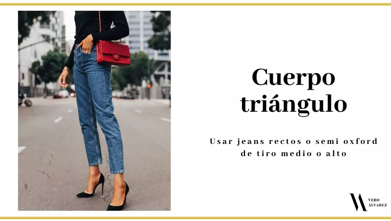 -Cuerpo triángulo: hay que evitar llamar la atención a las caderas, lo que se logra con jeans rectos o semi oxford de tiro medio o alto. Eviten los chupines, los capri, los pescadores y los bolsillos laterales. Un buen denim recto tiro alto las va a salvar en toda ocasión.