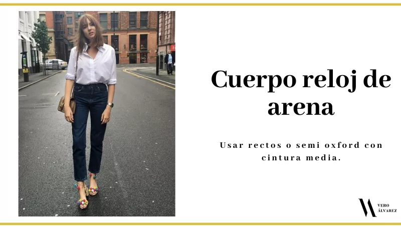 -Cuerpo reloj de arena: los perfectos son los que resaltan las curvas sin exagerar. Por eso, recomiendo los jeans rectos o semi oxford con cintura media. Hay que evitar bolsillos delanteros que generan un volumen extra innecesario.