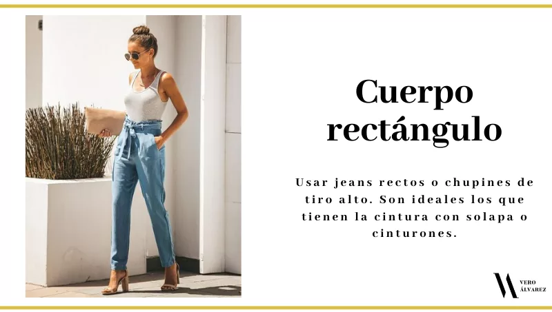 -Cuerpo rectángulo: lo fundamental es lograr generar cintura para darle curvas al cuerpo, lo que se consigue con jeans rectos o chupines de tiro alto. Son ideales los que tienen la cintura con solapa o cinturones.