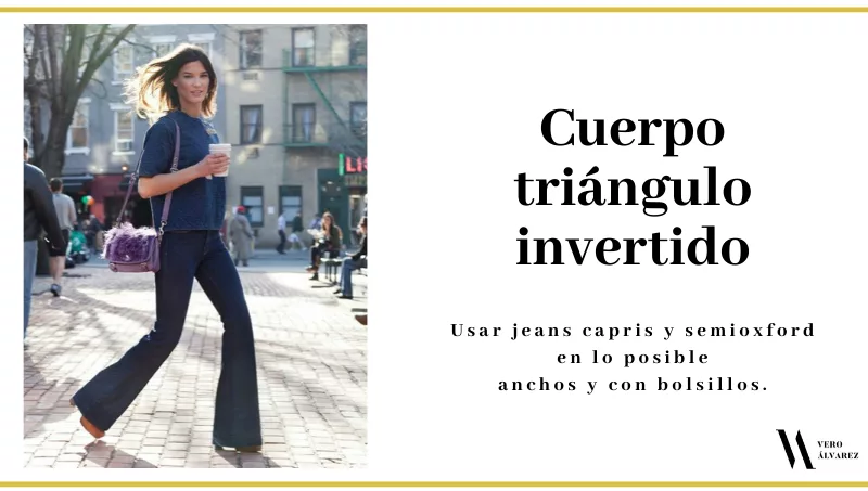 -Cuerpo triángulo invertido: el jean recomendado es el que genera volumen en la parte inferior del cuerpo, por lo que deben usar jeans semi oxford o capris y en lo posible anchos con bolsillos. Los de estampados, de colores o tonos claros son una excelente opción. Se debe evitar los chupines.