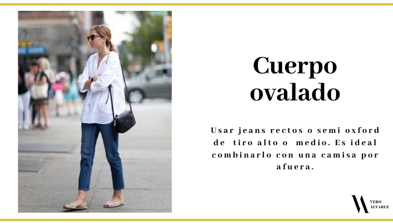 -Cuerpo ovalado: si tienen un cuerpo con forma más redondeada, lo ideal es resaltar la cintura y disimular el vientre. Esto se logra con jeans rectos o semi oxford de tiro alto o medio. Queda muy bien un denim semi oxford con una camisa suelta por afuera. Deben evitar los chupines y pata de elefante.