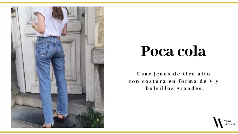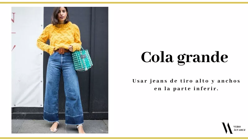 - Cola grande: si tienen mucha cola y no les gusta resaltarla, les recomiendo poner el punto focal en otro lado, que se logra con jeans de tiro alto y anchos en la parte inferior.