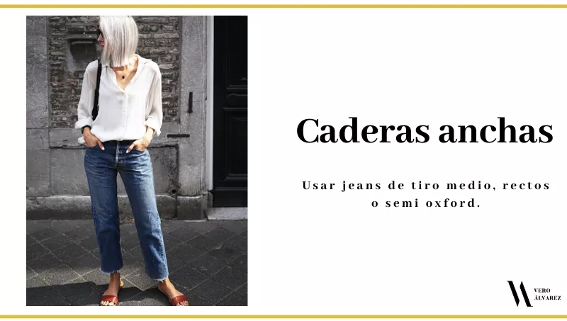 -Caderas anchas: para disimular las caderas y hacerlas un poco más pequeñas, lo mejor es usar jeans de tiro medio, rectos o semi oxford. Si lo combinan con un blazer de largo a la altura de la cadera es el look perfecto.