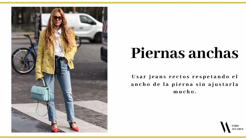 -Piernas anchas: les recomiendo usar jeans rectos respetando el ancho de la pierna sin ajustarla mucho. Otra opción que pueden probarse, son los boyfriend jeans y ver cómo se sienten con ellos. Eviten pantalones con pinzas y tiro medio.