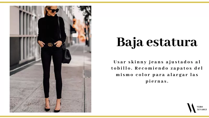 -Baja estatura: los ideales son lo skinny jeans ajustados al tobillo. Los colores oscuros benefician y más si se usan zapatos del mismo color para alargar las piernas.