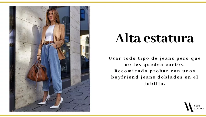 -Alta estatura: el mayor problema es encontrar unos jeans que no queden cortos como pescadores. Lo mejor de todo, es que pueden elegir todo tipo de pantalones, pero lo único que deben ser lo suficientemente largos. Les recomiendo probar con unos boyfriend jeans doblados en el tobillo y con unos jeans extra largos y anchos.