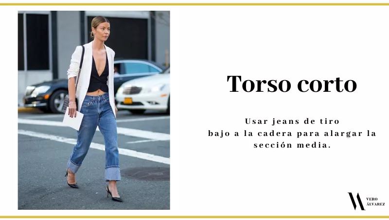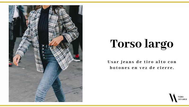 -Torso largo: recomiendo unos jeans de tiro alto con botones en vez de cierre. Con esto se logra centrar toda la atención a los botones y hacer que la zona superior se vea un poco más pequeña.