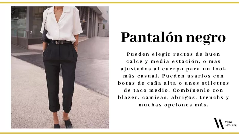 -Pantalón negro: es una de las prendas fundamentales para las ocasiones más formales. Pueden elegir rectos de buen calce y media estación, o más ajustados al cuerpo para un look más casual. Pueden usarlos con botas de caña alta o unos stilettos de taco medio. Combínenlo con blazer, camisas, abrigos, trenchs y muchas opciones más.