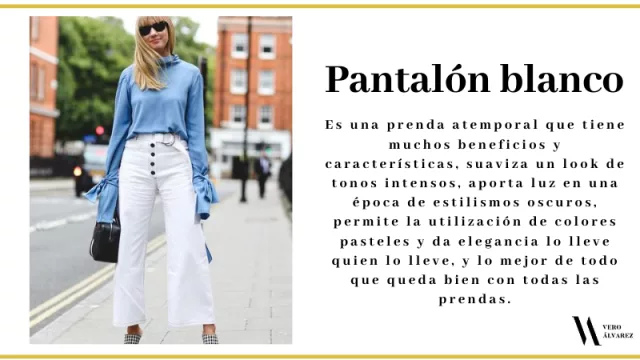 -Pantalón blanco: es una prenda que se han convertido en protagonistas en nuestro armario invernal. Hace unas temporadas parecía que el blanco era solo para las temporadas de verano pero hoy en día es atemporal, se usa haya la temperatura que haya. Un pantalón blanco tiene muchos beneficios y características, suaviza un look de tonos intensos, aporta luz en una época de estilismos oscuros, permite la utilización de colores pasteles y da elegancia lo lleve quien lo lleve, y lo mejor de todo que queda bien con todas las prendas.