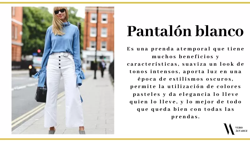 -Pantalón blanco: es una prenda que se han convertido en protagonistas en nuestro armario invernal. Hace unas temporadas parecía que el blanco era solo para las temporadas de verano pero hoy en día es atemporal, se usa haya la temperatura que haya. Un pantalón blanco tiene muchos beneficios y características, suaviza un look de tonos intensos, aporta luz en una época de estilismos oscuros, permite la utilización de colores pasteles y da elegancia lo lleve quien lo lleve, y lo mejor de todo que queda bien con todas las prendas.