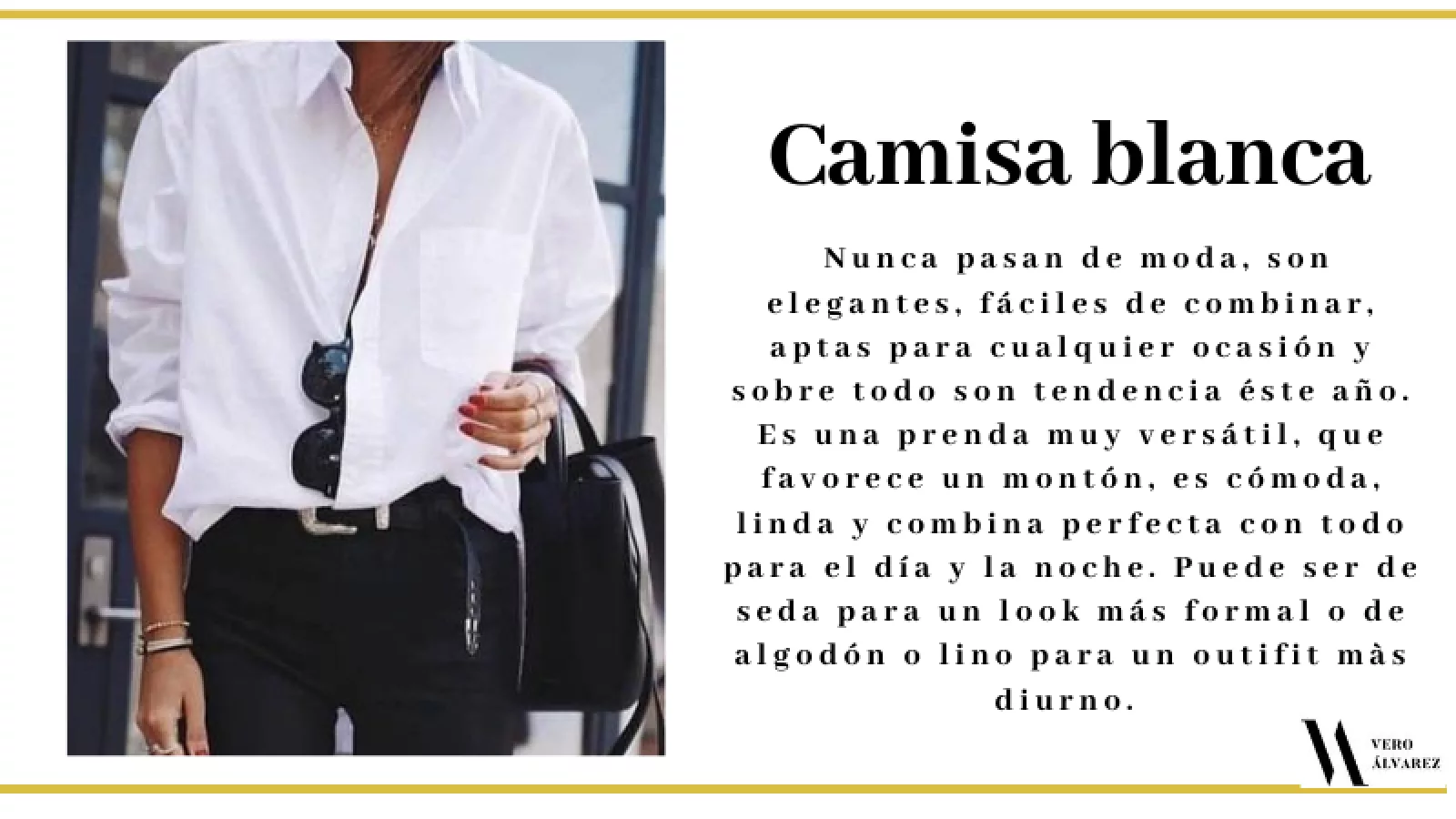 -Camisa blanca: es un básico entre los básicos. Nunca pasan de moda, son elegantes, fáciles de combinar, aptas para cualquier ocasión y sobre todo son tendencia este año. Es una prenda muy versátil, que favorece un montón, es cómoda, linda y combina perfecta con todo para el día y la noche. Puede ser de seda para un look más formal o de algodón o lino para un outifit más diurno. Es un comodín para cualquier look.