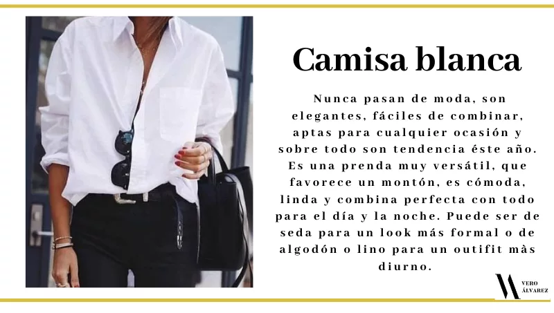 -Camisa blanca: es un básico entre los básicos. Nunca pasan de moda, son elegantes, fáciles de combinar, aptas para cualquier ocasión y sobre todo son tendencia este año. Es una prenda muy versátil, que favorece un montón, es cómoda, linda y combina perfecta con todo para el día y la noche. Puede ser de seda para un look más formal o de algodón o lino para un outifit más diurno.  Es un comodín para cualquier look.