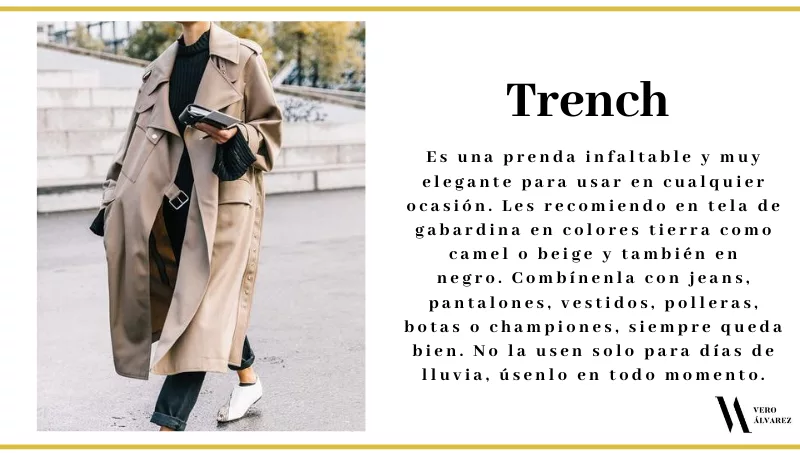 -Trench: es una prenda infaltable y muy elegante para usar en cualquier ocasión. Les recomiendo en tela de gabardina en colores tierra como camel o beige y también en negro. Combínenla con jeans, pantalones, vestidos, polleras, botas o championes, siempre queda bien. No la usen solo para días de lluvia, úsenlo en todo momento.