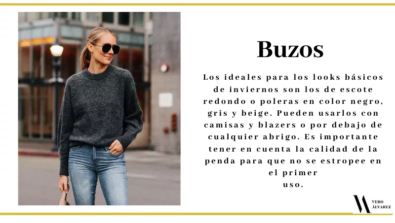 -Buzos: los ideales para los looks básicos de inviernos son los de escote redondo o poleras en color negro, gris y beige. Pueden usarlos con camisas y blazers o por debajo de cualquier abrigo. Es importante tener en cuenta la calidad de la penda para que no se estropee en el primer uso.