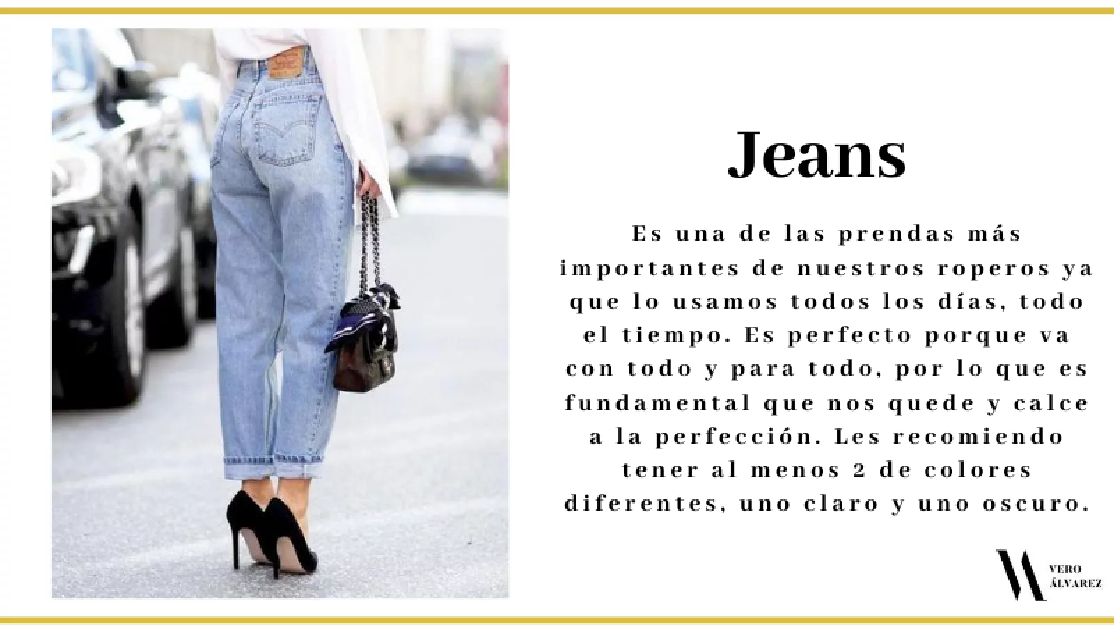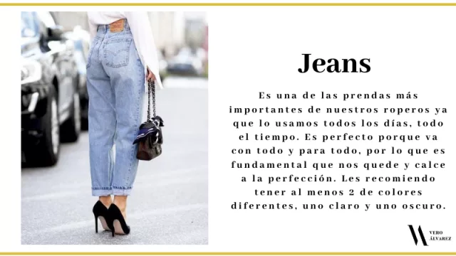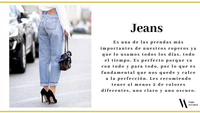 -Jeans: es una de las prendas más importantes de nuestros roperos ya que lo usamos todos los días, todo el tiempo. Es perfecto porque va con todo y para todo, por lo que es fundamental que nos quede y calce a la perfección. Les recomiendo tener al menos 2 de colores diferentes, uno claro y uno oscuro.