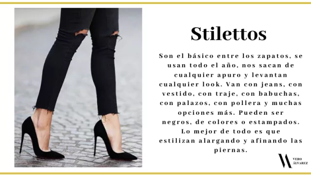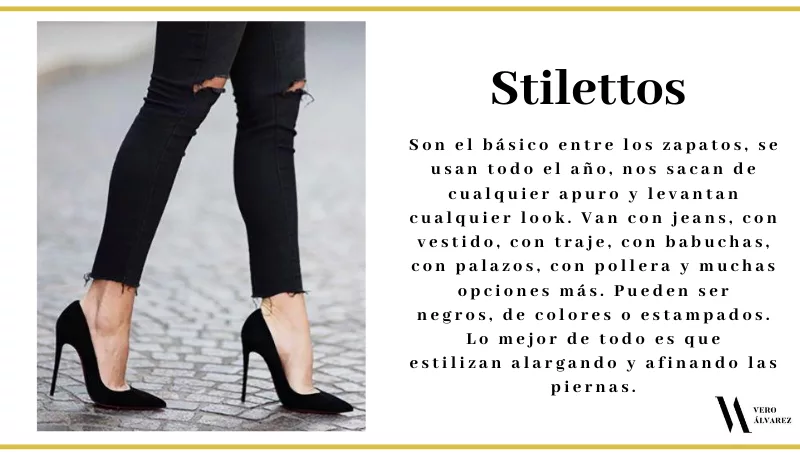 -Stilettos: son el básico entre los zapatos, se usan todo el año, nos sacan de cualquier apuro y levantan cualquier look. Van con jeans, con vestido, con traje, con babuchas, con palazos, con pollera y muchas opciones más. Pueden ser negros, de colores o estampados. Por todo esto, no deberían faltar un par en nuestro placard, y lo mejor de todo es que es el zapato que mejor nos queda ya que estiliza alargando y afinando las piernas.