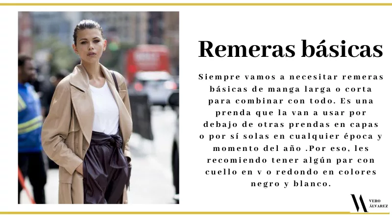 -Remeras básicas: siempre pero siempre vamos a necesitar remeras básicas de manga larga o corta para combinar con todo. Es una prenda que la van a usar por debajo de otras prendas en capas o por sí solas en cualquier época y momento del año. Por eso, les recomiendo tener algún par con cuello en v o redondo en colores negro y blanco.