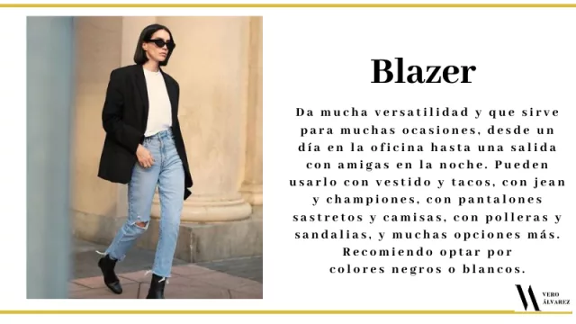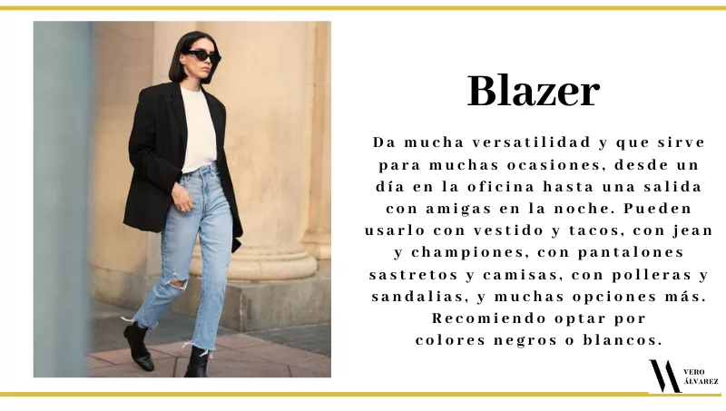 -Blazer: es una prenda que nunca nos puede faltar ya que da mucha versatilidad y que sirve para muchas ocasiones, desde un día en la oficina hasta una salida con amigas en la noche. Pueden usarlo con vestido y tacos, con jean y championes, con pantalones sastreros y camisas, con polleras y sandalias, y muchas opciones más. Recomiendo optar por colores negros o blancos.