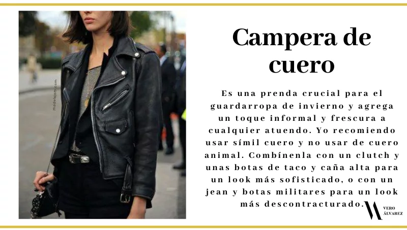 -Campera de cuero: es una prenda crucial para el guardarropa de invierno y agrega un toque informal y frescura a cualquier atuendo. Es un touch rocker ideal para nuestros looks y que se vuelve el abrigo indispensable para una salida de noche. Yo recomiendo usar símil cuero y no usar de cuero animal. Combínenla con un clutch y unas botas de taco y caña alta para un look más sofisticado, o con un jean y botas militares para un look más descontracturado.