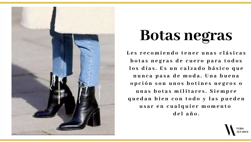 -Botas negras: les recomiendo tener unas clásicas botas negras de cuero para todos los días. Es un calzado básico que nunca pasa de moda. Una buena opción son unos botines negros o unas botas militares. Siempre quedan bien con todo y las pueden usar en cualquier momento del año.