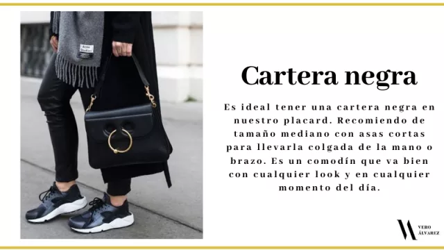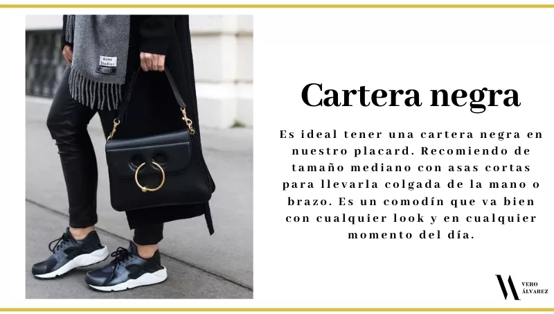 -Cartera negra: es ideal tener una cartera negra en nuestro placard. Recomiendo de tamaño mediano con asas cortas para llevarla colgada de la mano o brazo. Es un comodín que va bien con cualquier look y en cualquier momento del día.