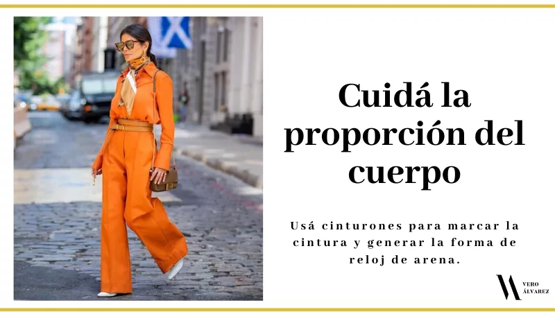 -Proporción: más que privarse de llevar ciertos colores, deben pensar en cómo equilibrar el conjunto. Si su cuerpo es triángulo invertido (hombros son más anchos que las caderas), deben de optar por tonos más oscuros en la parte superior y más claros o llamativos en la inferior. Si su cuerpo es triángulo (caderas más ancha que hombros) lleven el color intenso a la parte superior. Si su cuerpo es rectángulo (sin cintura marcada) usen cinturones para marcarla.