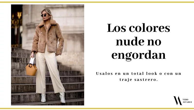-Los tonos nude o el beige: tienden a dar miedo a usarlos ya que pensamos que nos hacen más anchas o voluminosas, pero esto no es correcto. Las invito a usarlo en un traje sastrero y chaqueta ligeramente oversized, o en un look monocromo.