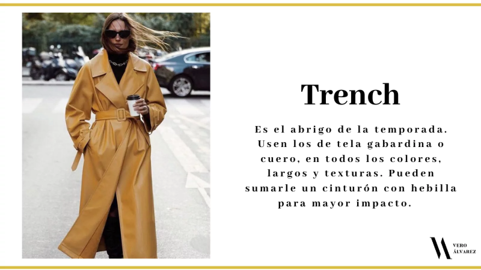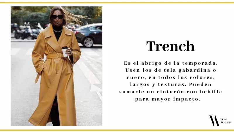 -Trench: si quieren un abrigo más liviano pueden elegir el sofisticado trench en tela gabardina o cuero, en todos los colores, largos y texturas. No lo usen solo para días de lluvia, ya que al ser el abrigo de moda de la temporada, lo pueden usar tanto de día como a la noche. Si ya tienen el clásico impermeable, es momento de animarse a sumar algún otro en color más shocking o distintivo. Si no son amantes de los colores, entonces, pueden elegir alguno con una morfología un poco distintiva que salga de lo normal, como solapas grandes o cinturones con grandes hebillas.