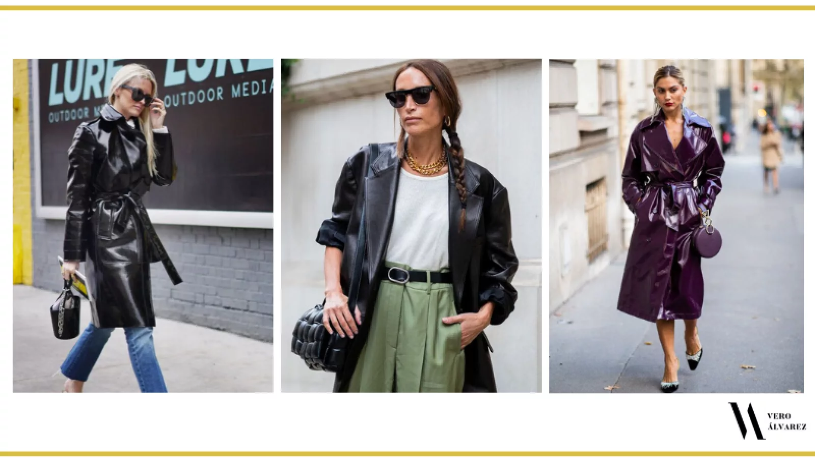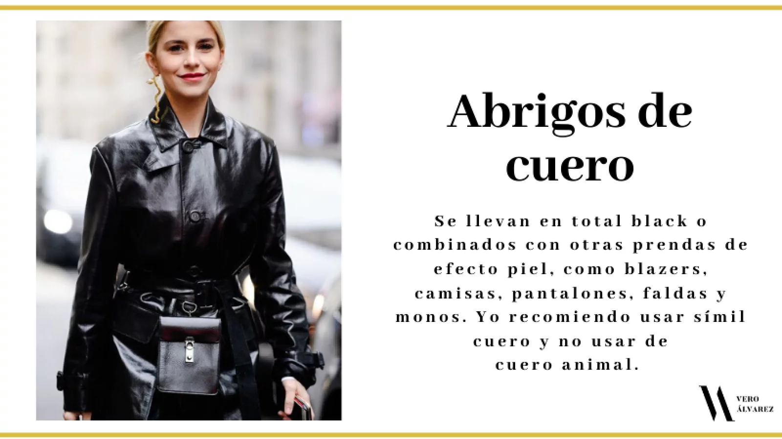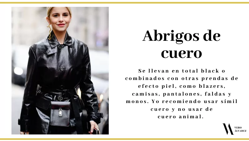 -Abrigos de cuero: los abrigos de cuero largos hasta las rodillas son el descubrimiento de la temporada. Se llevan en total black o combinados con otras prendas de efecto piel, como blazers, camisas, pantalones, faldas y monos. Yo recomiendo usar símil y no usar de cuero animal. Combínenlos con un clutch y unas botas de taco y caña alta para un look más sofisticado, o con un jean y botas militares para un look más descontracturado.
