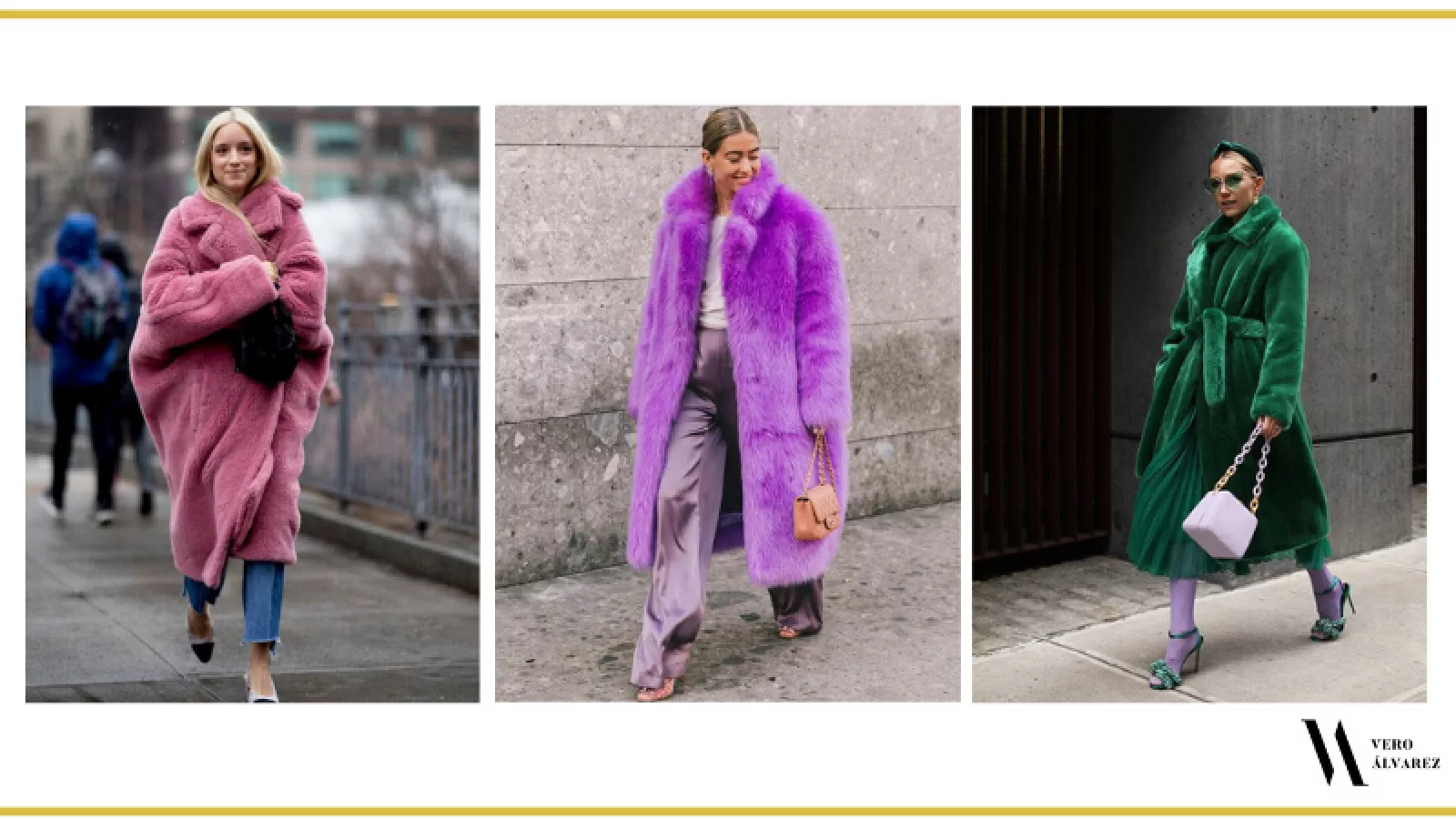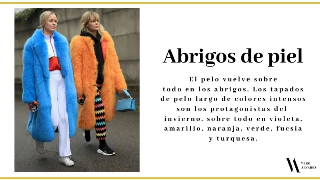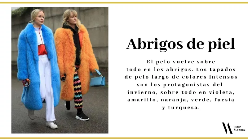 -Abrigos de piel de color: el pelo vuelve sobre todo en los abrigos, pero en su forma más sintética y ochentosa. Los tapados de pelo largo de colores intensos son los protagonistas del invierno, sobre todo en violeta, amarillo, naranja, verde, fucsia y turquesa. Es elegante, chic, canchero, abrigado, con mucho estilo y queda bien con todo. Gracias a su estructura y pelos es muy abrigado, por lo que pueden usarlo con prendas finas y ligeras por debajo. Es una prenda que me encanta y creo que todas deberíamos tenerlo en el armario y salir a relucirlo.