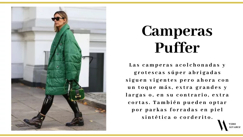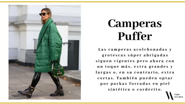 -Camperas Puffer: sí, siguen usándose. Las camperas acolchonadas y grotescas súper abrigadas siguen vigentes pero ahora con un toque más, extra grandes y largas o, en su contrario, extra cortas. La más polémicas y solicitadas son las puffer en XL en crudo o blanco. Esta prenda es muy abrigada y cómoda pero no a todas nos queda bien. Yo la recomiendo para personas delgadas y altas. También pueden optar por parkas forradas en piel sintética o corderito.