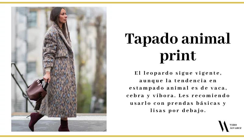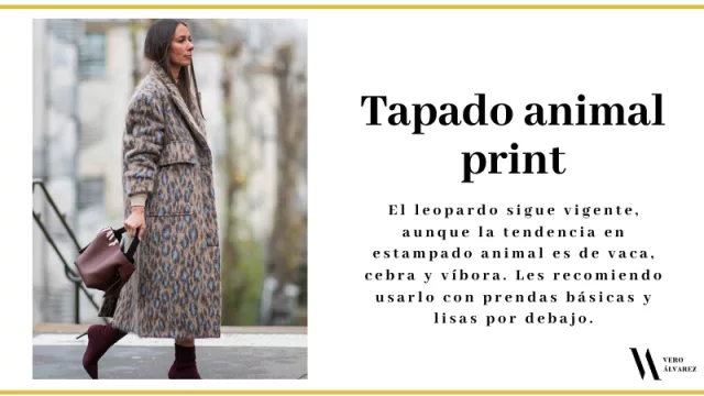 -Tapado animal print: el estampado animal print está en su mejor momento y este año se viene con todo en los tapados y chaquetas. El leopardo sigue vigente, aunque la tendencia en estampado animal es de vaca, cebra y víbora. Les recomiendo usarlo con prendas básicas y lisas por debajo.