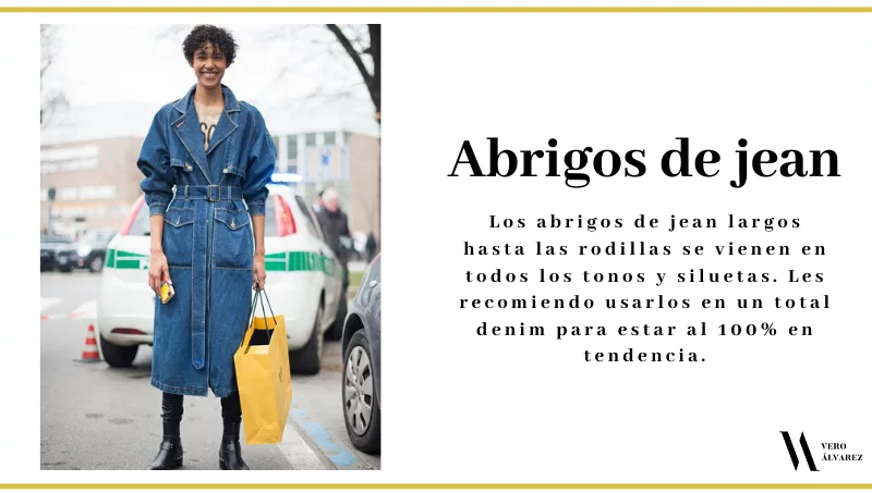 -Abrigos de jean: el denim es otra textura infaltable en la temporada, acompañando así al color Pantone 2020. Los abrigos de jean largos hasta las rodillas o más largos, se vienen en todos los tonos y siluetas. Les recomiendo usarlos en un total denim para estar al 100% en tendencia.