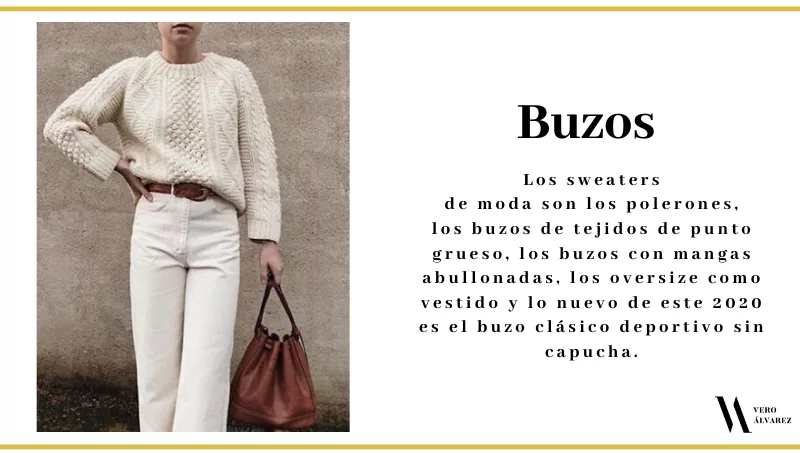 -Buzos: los sweaters de moda son los polerones, los buzos de tejidos de punto grueso, los buzos con mangas abullonadas, los oversize como vestido y lo nuevo de este 2020 es el buzo clásico deportivo sin capucha que viene a hacer juego con un jogging. Estos buzos son ideales para el homeoffice o los fines de semana. Les recomiendo combinarlos con una camisa para un look más formal.