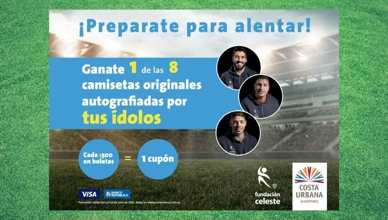Para que ese hincha de la Celeste que todos llevamos dentro se vista como debe ser, el próximo viernes 18 de junio Costa Urbana Shopping sorteará ocho camisetas originales de la selección uruguaya de fútbol que vienen autografiadas por los jugadores. ¡Un golazo de media cancha!