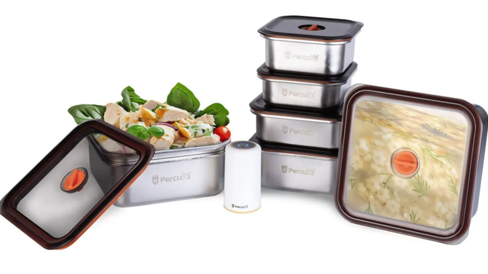 La colección incluye una bomba automática de vacío, recargable por USB. Este dispositivo compacto y liviano permite sellar al vacío los recipientes en cuestión de segundos, prolongando la vida útil de los alimentos hasta cinco veces más.