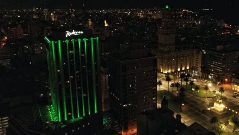 Diversas fachadas de edificios emblemáticos de la ciudad, como el Radisson Hotel, la Torre de los Homenajes del Estadio Centenario y la cúpula del Palacio Salvo, entre otros, se tiñeron de verde -el color de la naturaleza, la esperanza y la salud- para celebrar los 30 años de Suat Emergencia Móvil.