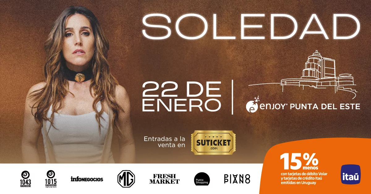 El 22 de enero, Soledad Pastorutti se presentará en Enjoy Punta del Este con un show que recorre 29 años de trayectoria. Reconocida con múltiples Latin GRAMMY®, dos Premios Diamante y más de un centenar de discos de Oro y Platino, “La Sole” volverá a interpretar las canciones que marcaron generaciones, entre ellas Brindis, en una de las últimas grandes citas musicales de enero.